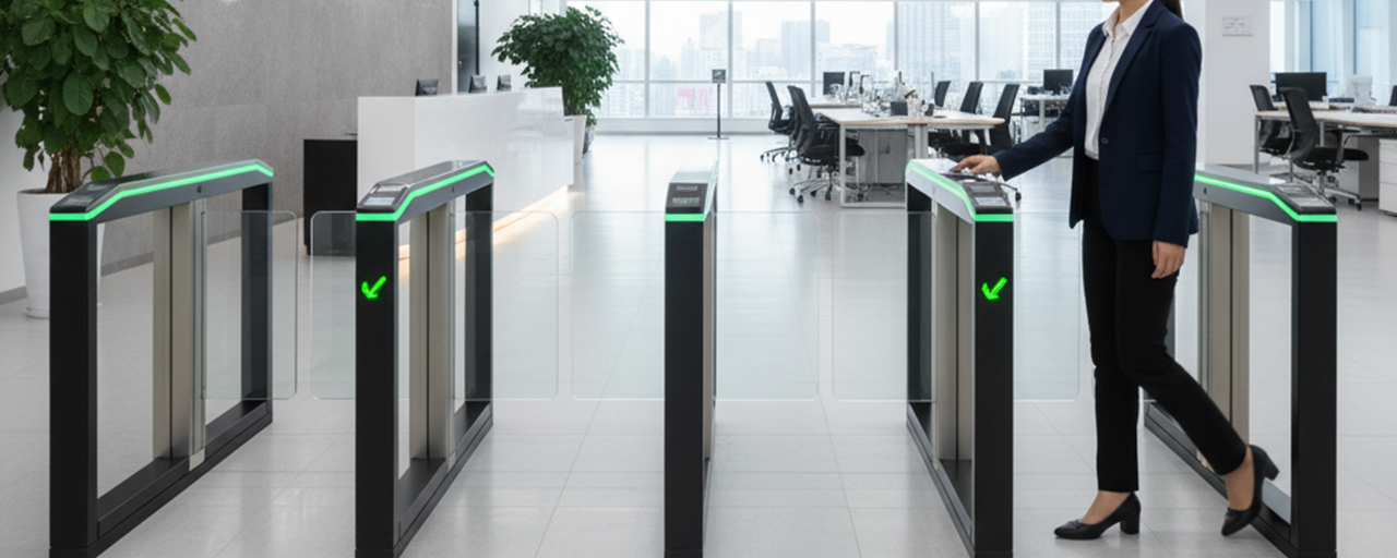 オフィス入口にセキュリティゲートを設置し、カード認証や指紋・顔認証システムを導入することで、確実な入室管理が行えます。従業員はスムーズに通過しつつ、許可のない人物の侵入をブロックできるため、防犯と利便性を両立しやすいのが特徴です。生体認証はなりすましを防止する効果も高く、機密性の高いフロアやサーバールームなどでは特に有用です。