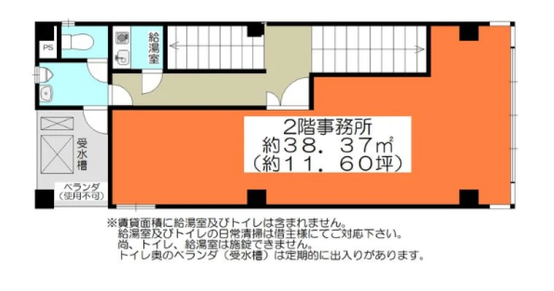 | ビル設備の備考 | トイレ・給湯室の定期清掃なし/トイレ奥のベランダには受水槽があり、ベランダの使用不可。ベランダは定期的に出入りします。 |