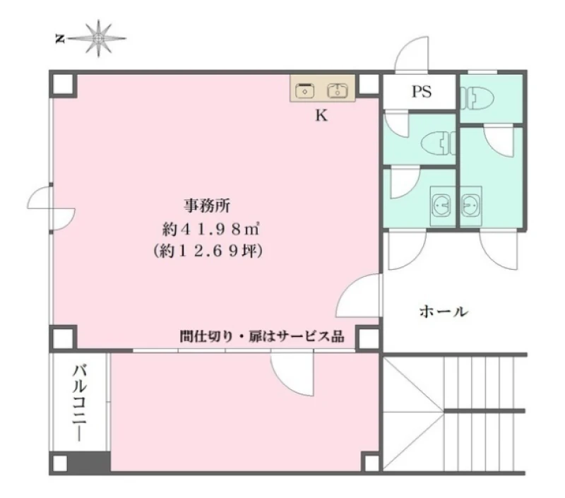 | 事務所内装の備考 | 設置済みのカーテン類・間仕切り・扉はサービス品(扉の鍵交換は借主負担)/インターネット未導入/キッチン:お湯の使用不可/照明器具 |