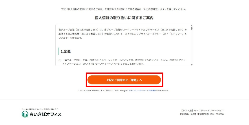 必要事項をご記入いただけましたら、ページ下の「上記にご同意の上「確認」へ」ボタンをクリックし、次のページで入力内容に間違いがないか最終確認を行ってください。