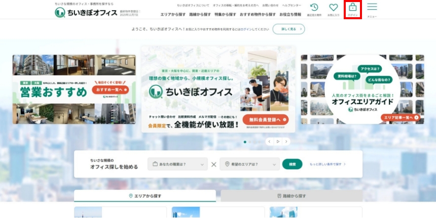 ちいきぼオフィスサイトの右上にある「ログイン」ボタンをクリックし、ログインページへ進んでください。