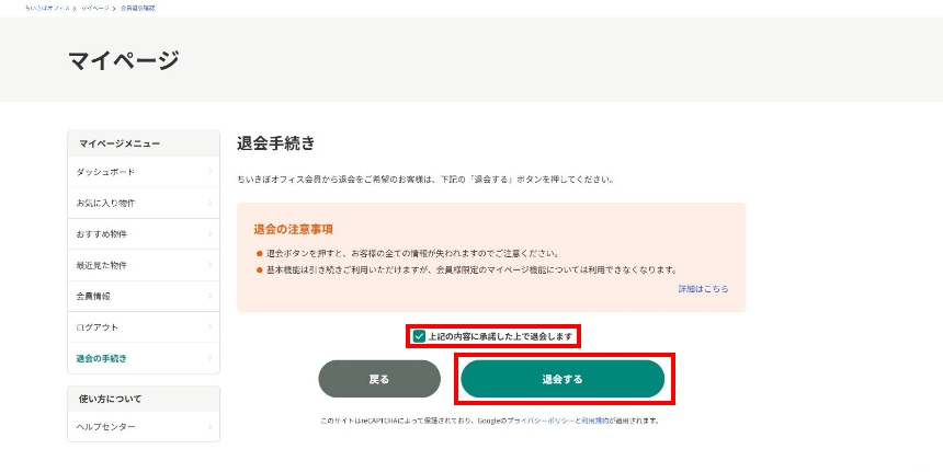 「退会の注意事項」をご確認の上、「上記の内容に承諾した上で退会します」にチェックを入れてから「退会する」ボタンを押してください。