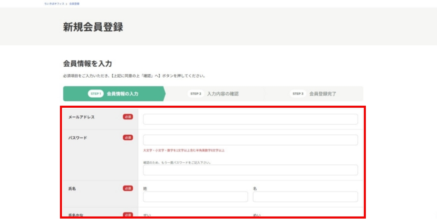 新規会員登録ページへアクセスし、氏名や連絡先などの必須項目を正確にご記入ください。