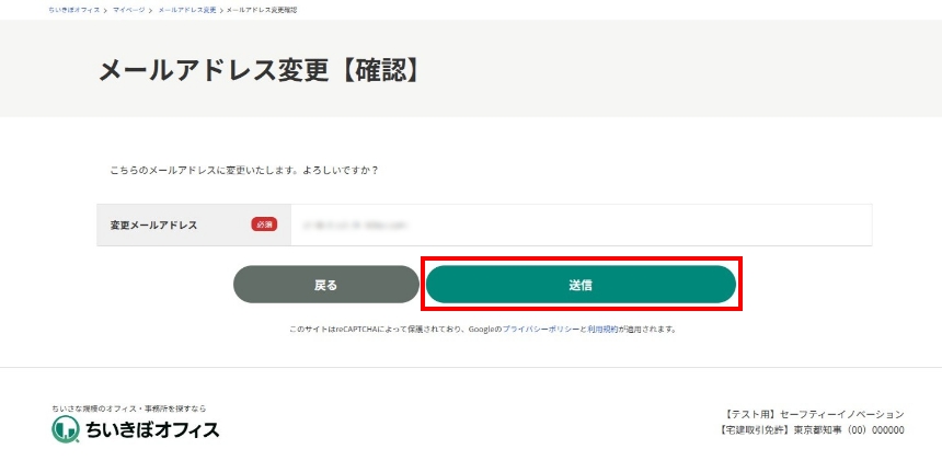メールアドレス変更の確認ページでにて、変更内容に間違いがないか確認し、「送信する」ボタンを押すと、変更が完了します。
