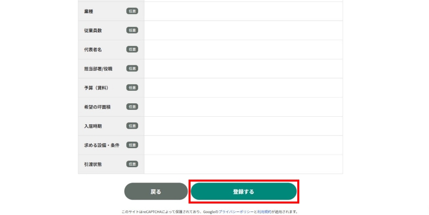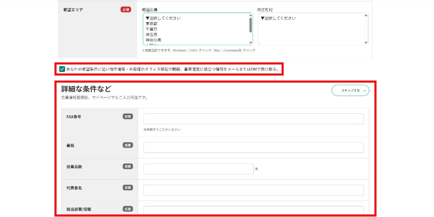 「あなたの希望条件に近い物件情報・お客様のオフィス移転や開設、事業運営に役立つ情報をメールまたはDMで受け取る。」にチェックを入れていただくと、新着物件情報や役立つメールマガジンを受け取りいただけます。