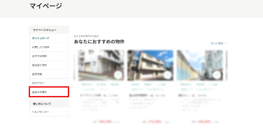 マイページや会員限定機能(お気に入り物件保存、物件の内見・お問い合わせ)も利用できなくなりますので、ご注意ください。