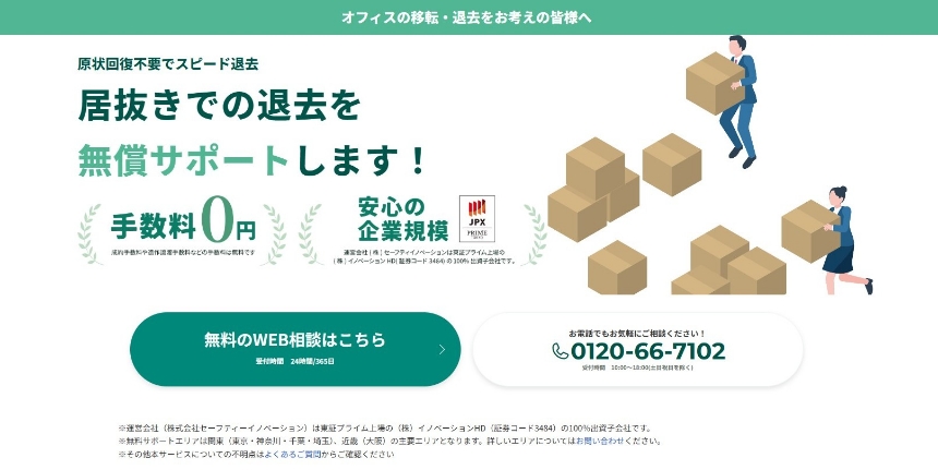 オフィス移転退去の無料サポートページの電話番号、または24時間受付のWEBフォームからご連絡ください。