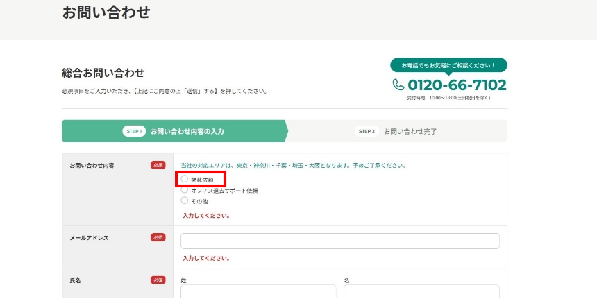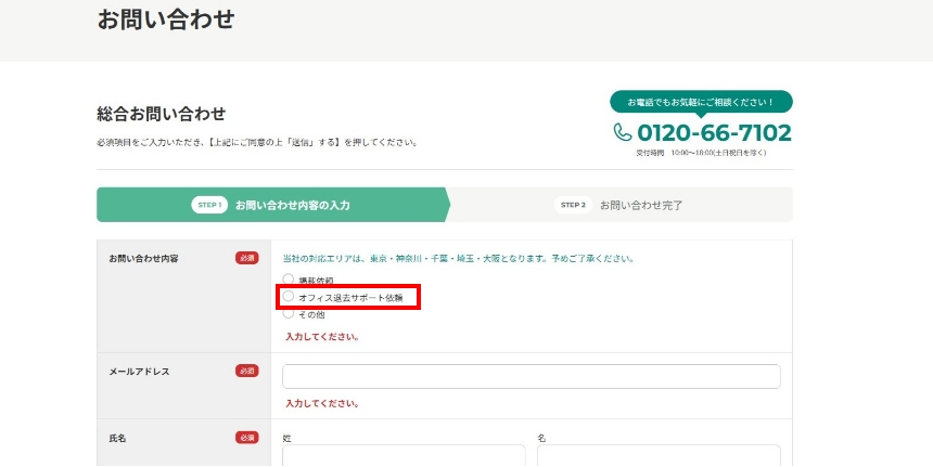 24時間受け付けております。「オフィス退去サポート依頼」を選択の上、必要事項ご記入いただきご連絡ください。