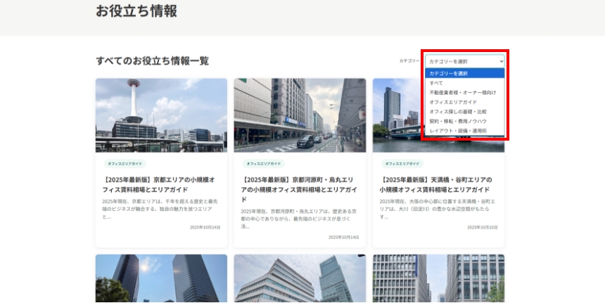 興味のある記事のタイトルをクリックすると、詳細ページをご覧いただけます。また、「カテゴリー」を選択することで、オフィスエリアガイドやオフィス探しの基礎・比較など、興味のあるジャンルの記事を絞り込むことができます。
